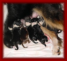 Now it were six wonderful and unforgettable weeks that laid before us. On the 12th day they opened their eyes, and shortly after they tried to walk around a bit. It was funny to see how they got better and better, and from the beginning of the third week on there was lots of action into the whelping box. They grew up very fast, increased their weight and with the fourth week we started to give them special puppy food. In the beginning moms breast was better, but they liked it more and more. Soon the feeding was a highlight and it was sweet to have a look at the eight of them peacefully together eating their meal.