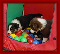 From the fifth week on, we had them outside into a big area in our garden. Every day we put a new toy or object into their place, so they always had something to discover. A tunnel,a tent full with balls and a little seesaw, there was always something to to for them. Our puppies were full of life and did the most funny things, for example one puppy was going into the tent and looked to the outside, and two other puppies took the tent and pulled it through the garden...the one inside really enjoying the trip. Every puppy had a thing he loved most, Linus for example loved a toy out of rubber which looked like a cock, and they all developed into little dogs with a character of their own.