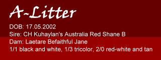 The following 8 puppies were born in our A-Litter. Please click on the name of the puppy to go to his own page with pictures and a short description what his life is all about today.