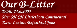 On April 27th, Faith has been covered by SH CH and Worldwinner 2003 Littlethorn Continental in Boulogne Sur Mer in France. The covering was superb, both liked each other and enjoyed the trip to the sea. In total Tally covered Faith three times and the tie was 20 minutes each. So on our way back home we had a good feeling that Faith was pregnant. On the 33rd day of the pregnancy was the ultrasound examination and the vet said there are a minimum of eight puppies in her belly. The puppies were born on Tuesday 24th of June and are all fine. It is 8 puppies, 6 dogs and 2 bitches which are all black and white! Pictures of the puppies can be seen below, just click the thumbnail to enlarge the pics. Pictures of Tally and Faith can be seen on our photos page. For a 7 generation pedigree of Tally please click here. ALL THE PUPPIES OUT OF THIS LITTER HAVE BEEN EYE-TESTED NORMAL AT 6 WEEKS OF AGE!