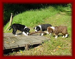 concerning the responsible job of breeding. First of all we will describe what made us breed this wonderful dogs so that you get an idea of our way. After that we would like to tell you a bit of our point of view concerning the breeding of living creatures, we will describe what is important to us and what demands we have in chosing our breeding stock or the raising of Border Collie puppies. In our puppy contract of sale you can see what we expect of people who are interested in a puppy out of our kennels, and the other way round what they can expect from us. To that, we will tell you where our kennel name comes from and meaning he has for us. If you have any questions, please feel free to E-Mail us. Common questions like “Where can I get a puppy of a breeder close to us” or “How expensive is a puppy” are answered in our “Questions (F.A.Q.) section, please have a look at this page before you send mail to us.